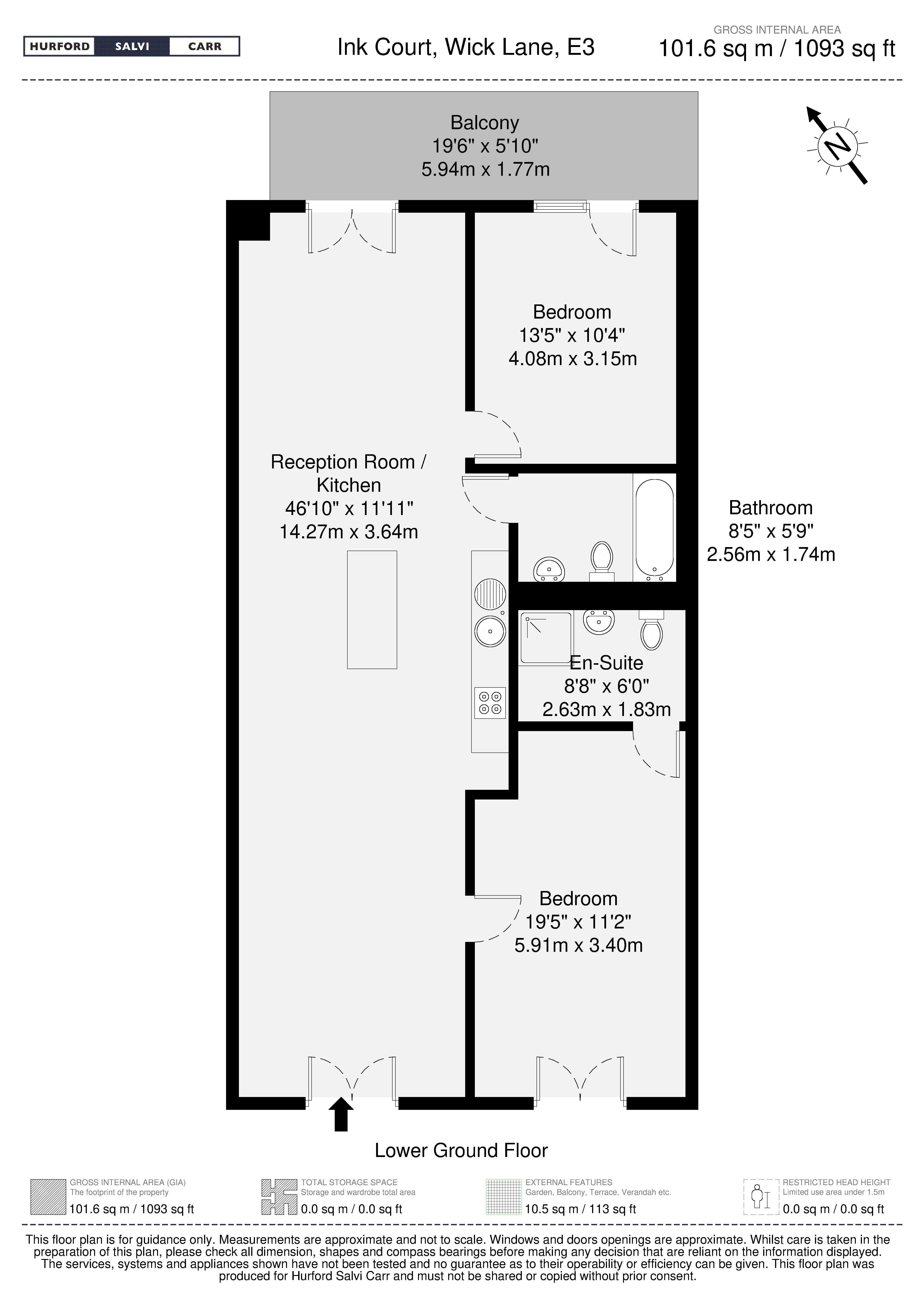 This large (1093sqft/101m2) flat on the ground floor of the secure Ink Court development, has a huge open plan kitchen reception room, two well sized double bedrooms, and two bathroom (One being en-suite to the master bedroom), and access to a private outside terrace that further leads on to a lovely garden area over the River Lea.